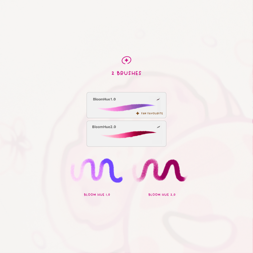 ✦ BloomHue 2.0: Select your base colour and based on your pressure, it will adjust the brightness and saturation of that selected colour (pink > dark maroon)